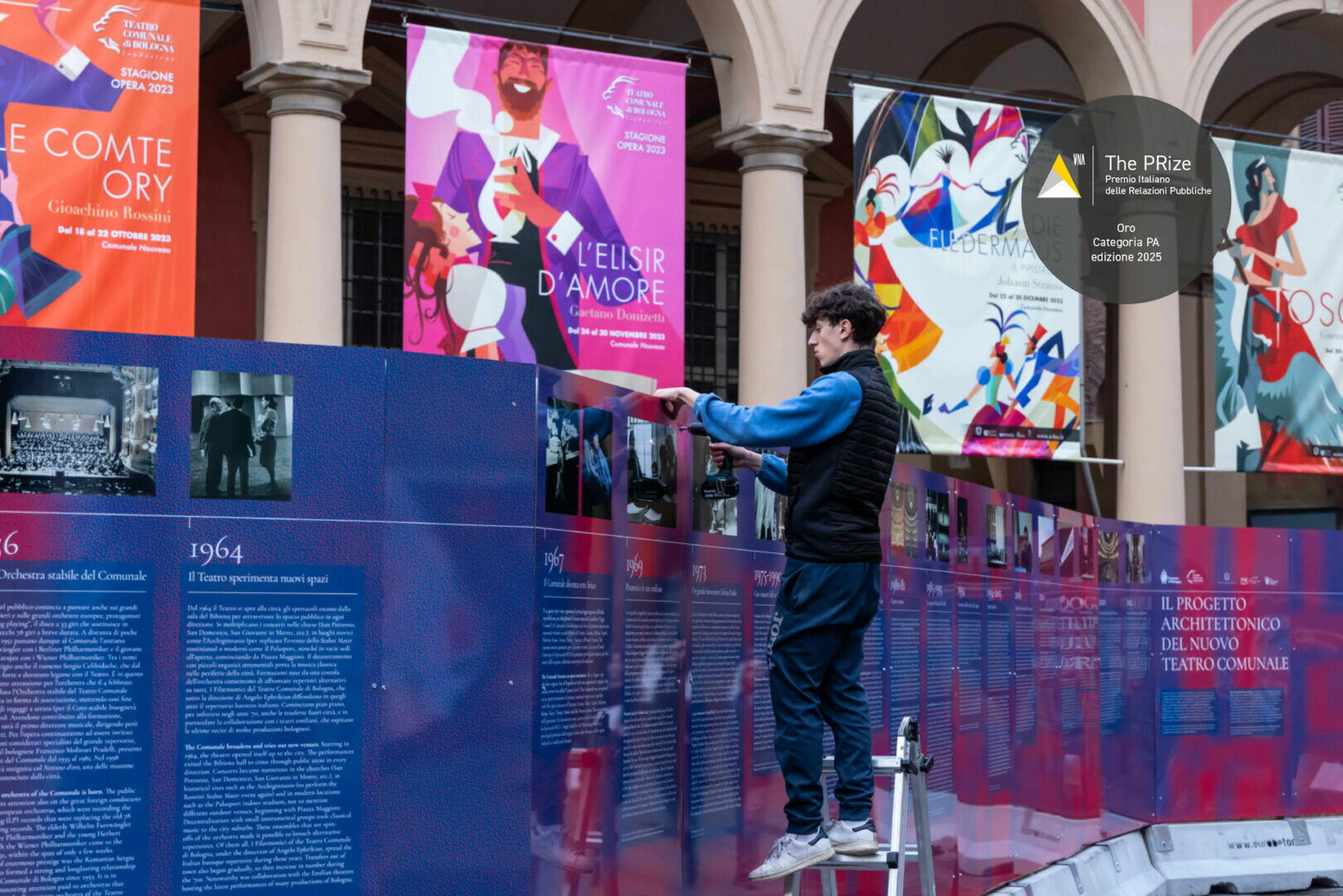 L’agenzia si è occupata della vestizione dei cantieri pilota progettando cinque allestimenti ad hoc, dal design alla definizione dell’apparato narrativo, e coordinando la produzione e installazione delle pannellature. Tra i progetti seguiti, è da citare in particolare il cantiere straordinario di protezione civile della Torre Garisenda, la cui comunicazione è stata destinata anche all’iniziativa di fundraising a sostegno del restauro, sotto l’headline “Bologna a cuore aperto”.